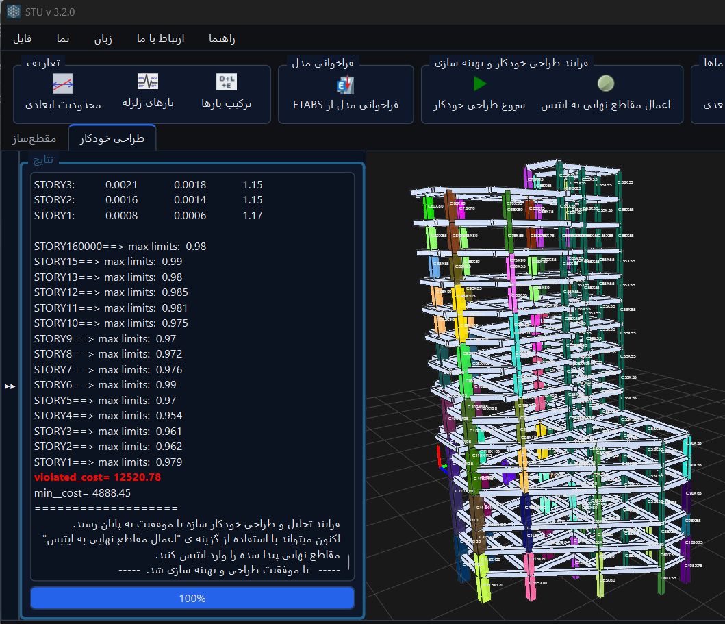 خودش شروع میکنه وصل میشه به ایتبس و اطلاعات مدل رو میگیره و هی تحلیل و طراحی میکنه (مستقل از ایتبس و داخل خود STU) و ازشون یاد میگیره و بهبود میده (با هوش مصنوعی) در کمتر از یک ساعت طرح نهایی رو به صورت فایل ایتبس به همراه گزارش محاسبات آماده میکنه و تحویل میده.